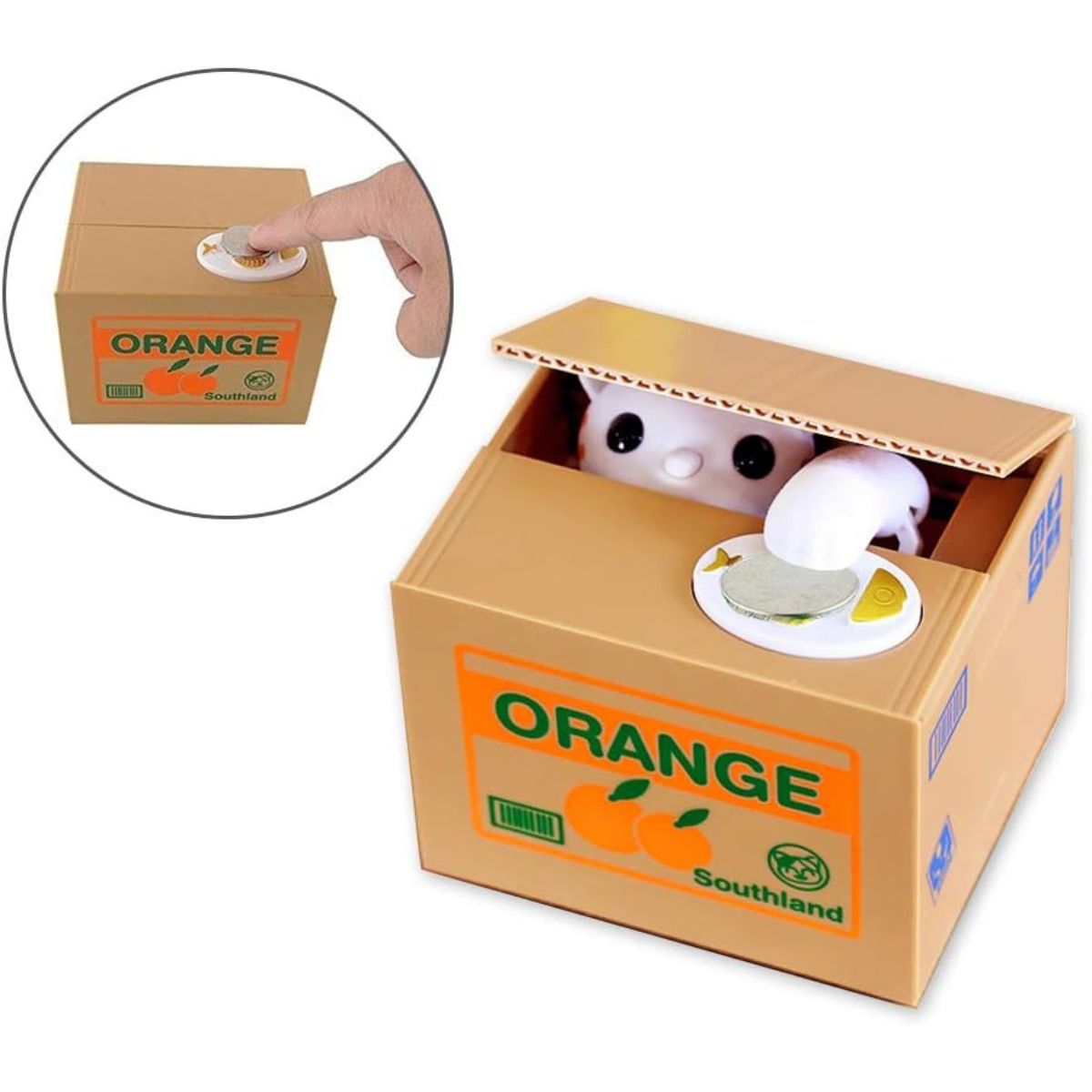 Alcancía interactiva del gato ladrón que roba tus monedas de forma divertida. Regalo perfecto para niños y adultos que hace del ahorro un juego entretenido.