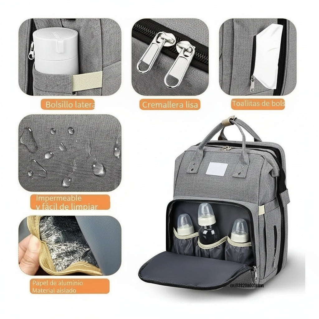La mochila pañalera definitiva que se transforma en cuna portátil y mudador. 14 bolsillos organizadores, material impermeable y diseño multifuncional para padres modernos.