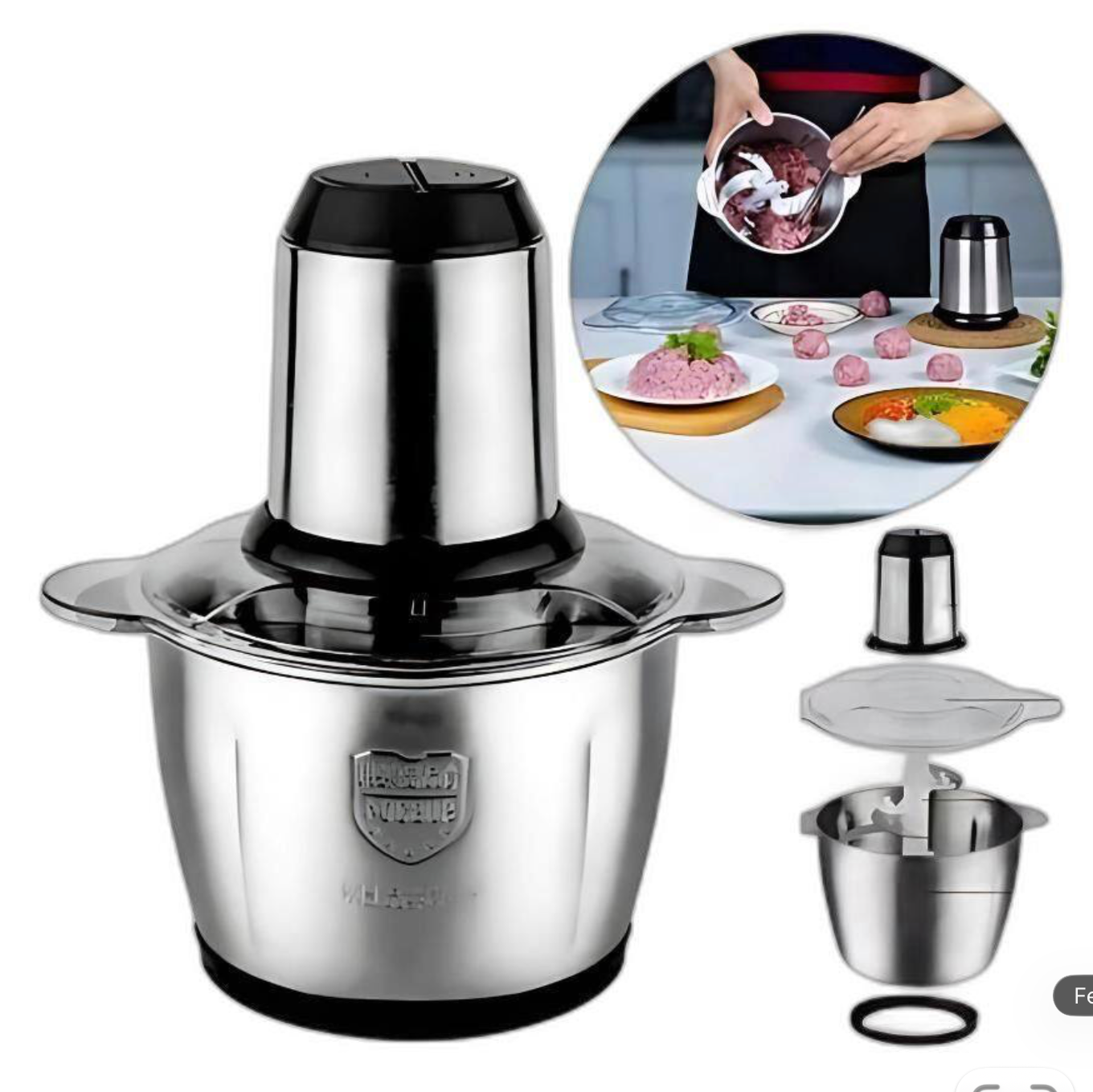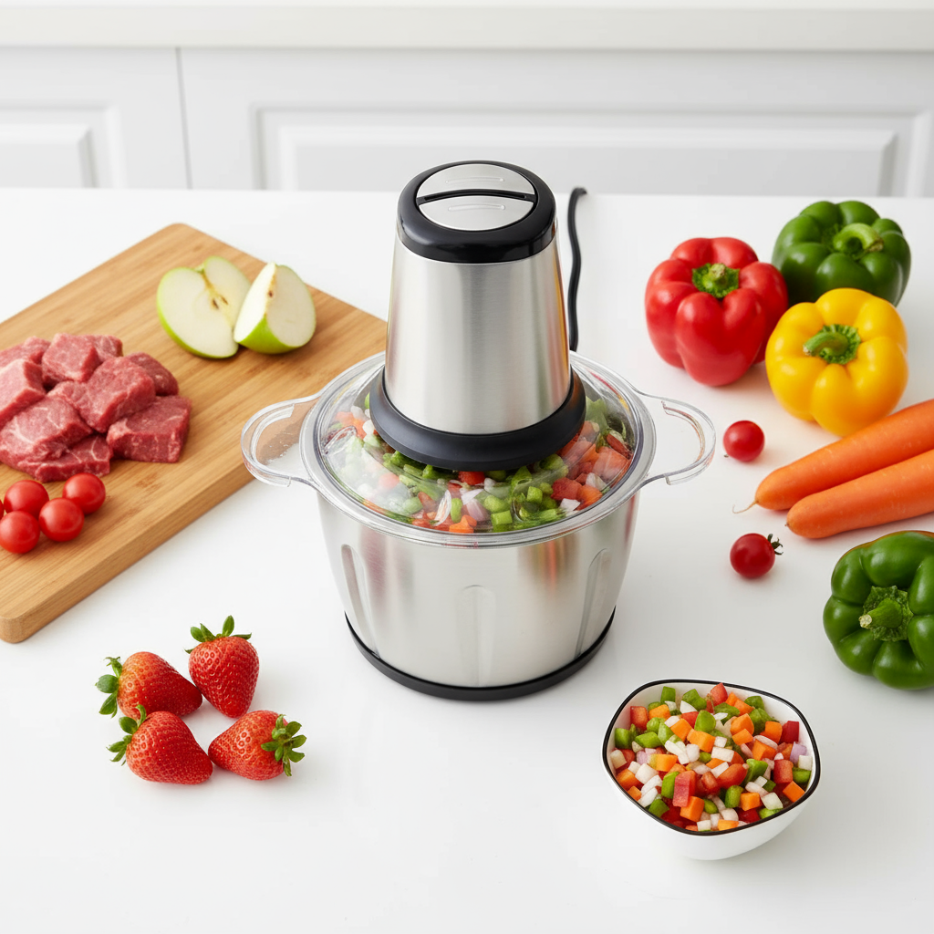 Picadora eléctrica de 2 litros de capacidad que procesa verduras, carnes, ajo y más en segundos. Potente motor y cuchillas de acero inoxidable para resultados perfectos.
