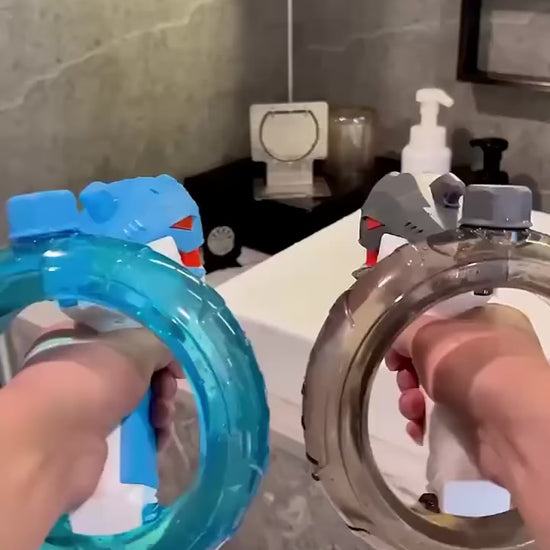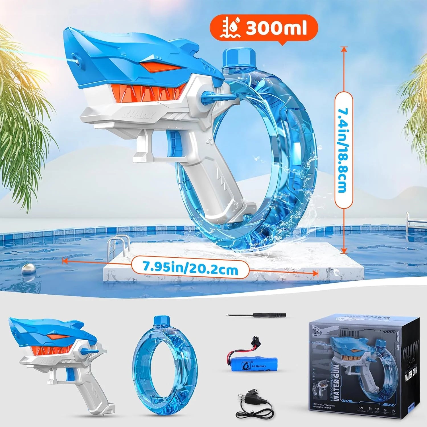 Lleva tus batallas de agua al siguiente nivel con esta pistola de agua eléctrica con diseño de tiburón, moderna y única. Con su tanque de 300 ml y anillo transparente texturizado, cada disparo es preciso y potente.
