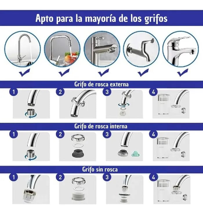 Incluye adaptadores universales que permiten instalarlo fácilmente en cualquier grifo estándar — ¡sin herramientas ni complicaciones!