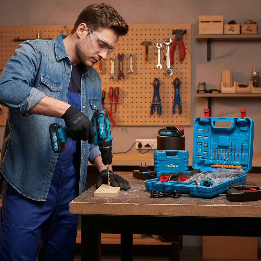 Taladro inalámbrico de alta potencia con función percutora, 2 baterías recargables y kit completo de accesorios. Perfecto para trabajos en madera, metal, ladrillo y cerámica.